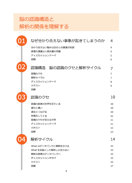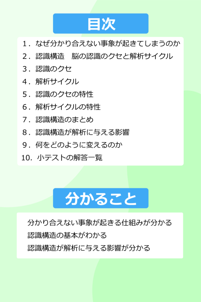 脳の認識構造である「認識のクセ」「解析サイクル」の基本を理解し、認識構造が解析にどのような影響を与えているのかを紐解いていきます。