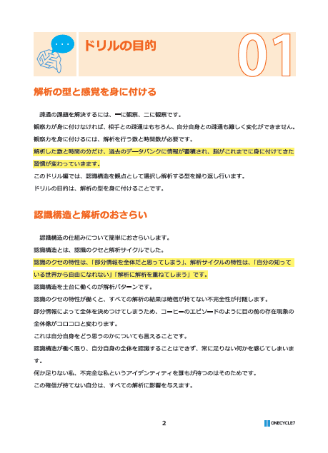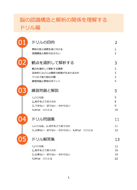 脳の認識構造と解析の関係を理解する 理解編で学んだ「観点を選択して解析する」をドリル形式で、解析の型を身に付けることが学べます。